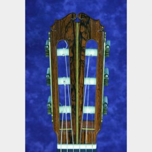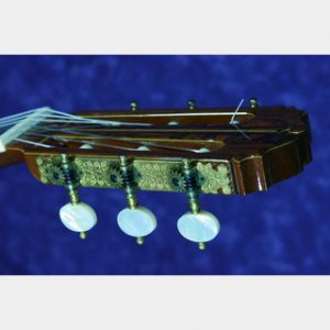『CUSTOM』仕様の内容は、基本を弦長640mmとして、サウンドホールの口輪に木目の綺麗なハカランダを貼り、糸巻きに世界最高峰のロジャース(¥160,000相当/マザー・オブ・パールつまみ)を装着し、ヘッドの化粧板を左右対称にて真ん中にハウザーのような縦線を飾りとして入れています。さらに、7フレットの指板脇に18金のポジションマークが付いています。