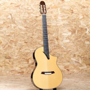 ドイツ発クラシックギター専門ブランド”Martinez”の薄胴モデル”MSCC-14 RS”。スプルーストップ、ローズウッドサイド&バックの定番機種です。本器はプレイコンディション良好のUSED品。薄胴ボディで、ネックも細くて握り易く、アコギ/エレキからの持ち替えにも対応し易い1本。マホガニーネック、ローズウッド指板&ブリッジ、サイドポート。小ぶりな薄胴ボディですが、サイズ感以上の生鳴りを体感いただけます。深みのある低音域とクリアな高音域のバランスもよくオールマイティに扱える1本です。側板にはサウンドポートが付いており、プレイヤーのモニタリングを助けてくれます。カッタウェイ仕様でハイポジションまでスムーズな演奏が可能。練習用やサブギターとしても活躍します。本体、付属ケースともにややタバコの匂いを感じます。表面上の打痕や擦り傷は多いですが、大きく目立つ傷はなくプレイ・ネックコンディションも良好です。薄胴サイズのハードケースが付属します。